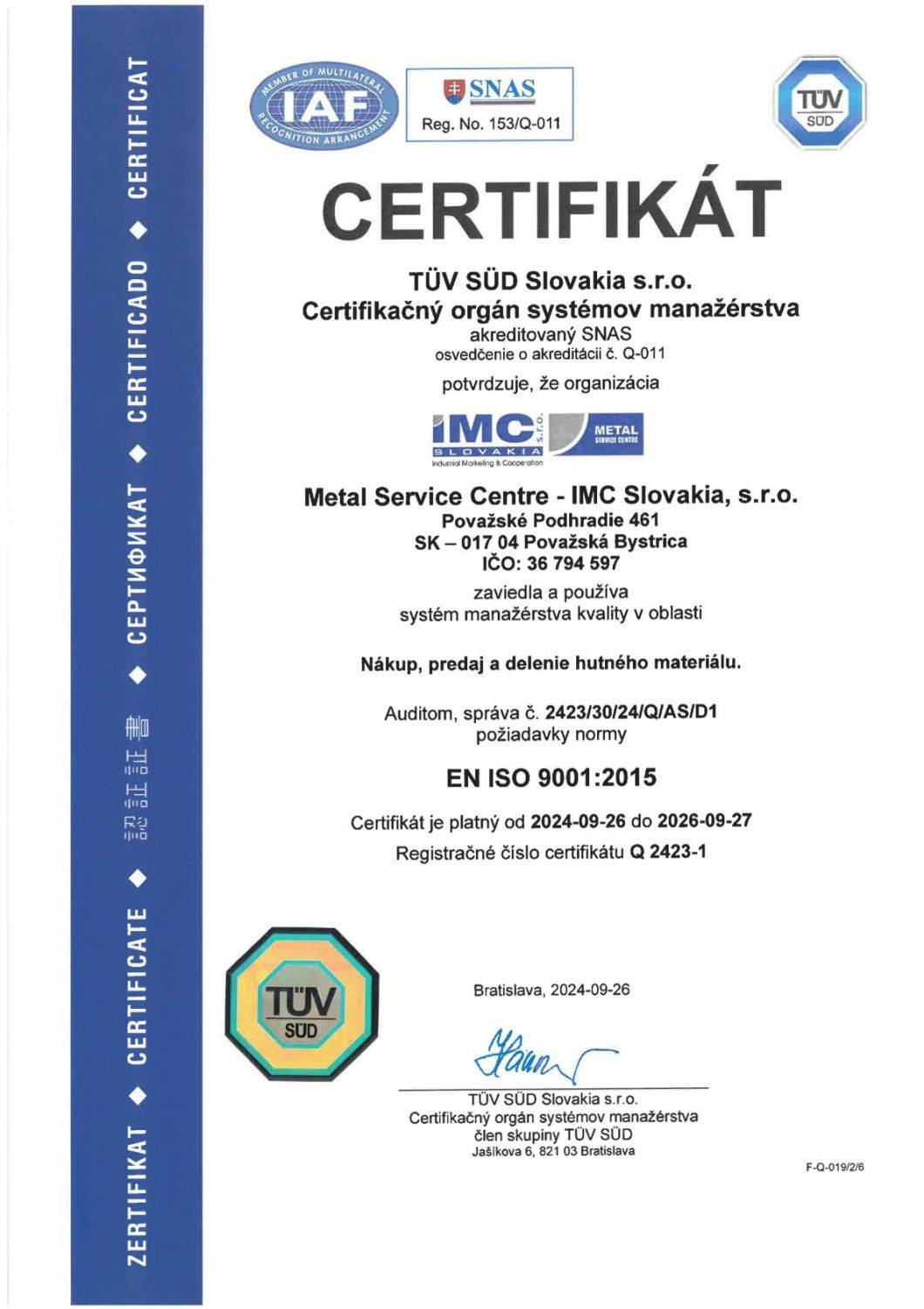 Metal Service Centre - IMC Slovakia s.r.o. patrí medzi lídrov na slovenskom trhu v oblasti dodávania a predaja hliníkových materiálov, hliníkovo-bronzových materiálov, bronzov, nerezu, ušľachtilých a konštrukčných ocelí určených na strojársku výrobu. Špecializuje sa na delenie materiálov.