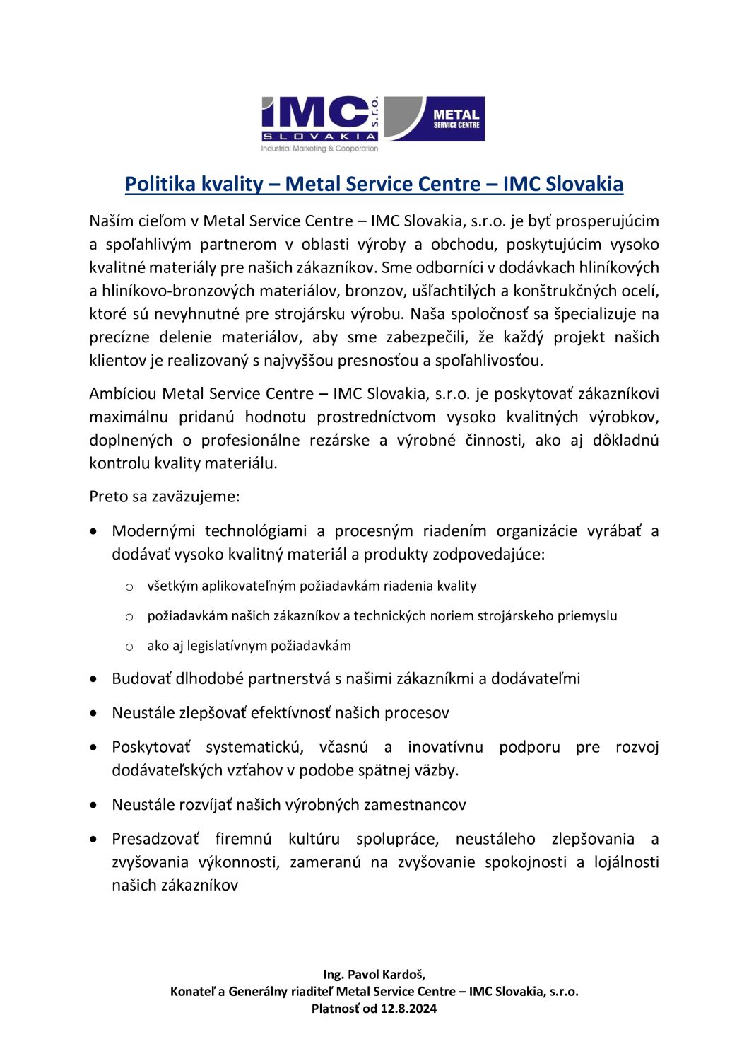 Metal Service Centre - IMC Slovakia s.r.o. patrí medzi lídrov na slovenskom trhu v oblasti dodávania a predaja hliníkových materiálov, hliníkovo-bronzových materiálov, bronzov, nerezu, ušľachtilých a konštrukčných ocelí určených na strojársku výrobu. Špecializuje sa na delenie materiálov.